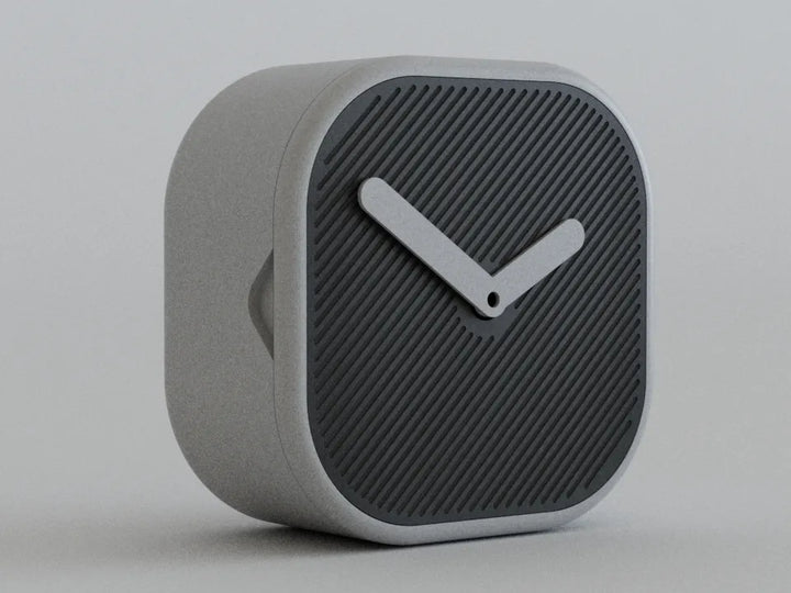 Sleek, compact, and deeply modern, the EchoGrid Minimal Desk Clock blends a matte silver frame with a textured black dial. Its bold hands and clean-cut shape bring a futuristic vibe to any workspace or room. Precision and style meet in this quiet, battery-powered timekeeper.
