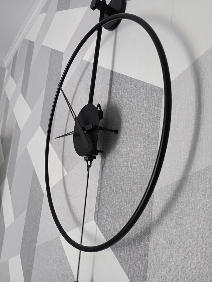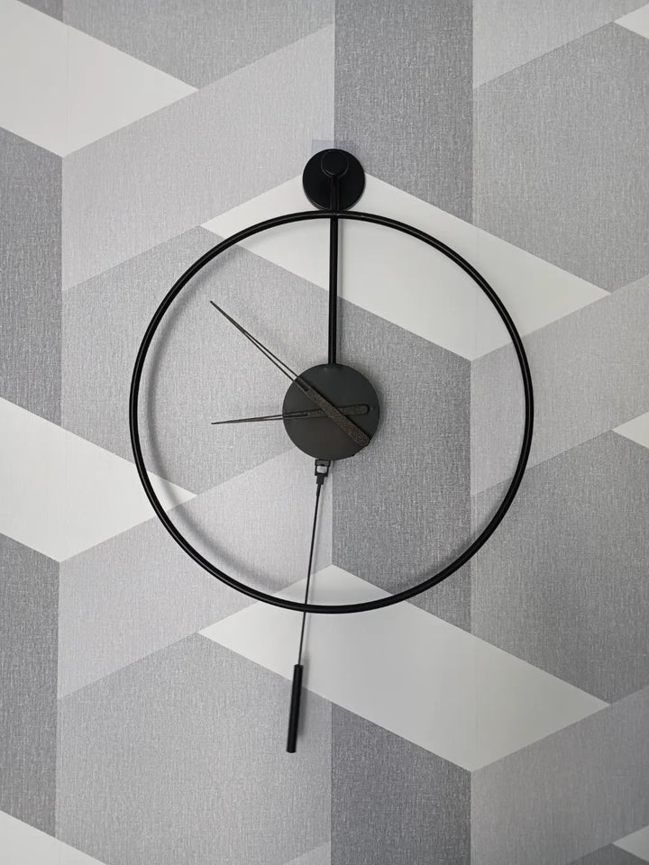 Introduce futuristic elegance to your space with the Orbit Minimalist Wall Clock. Featuring a suspended ring design with a linear pendulum, this modern wall clock blends kinetic sculpture with precise timekeeping. The matte black finish contrasts beautifully against any wall, making it a standout décor piece.