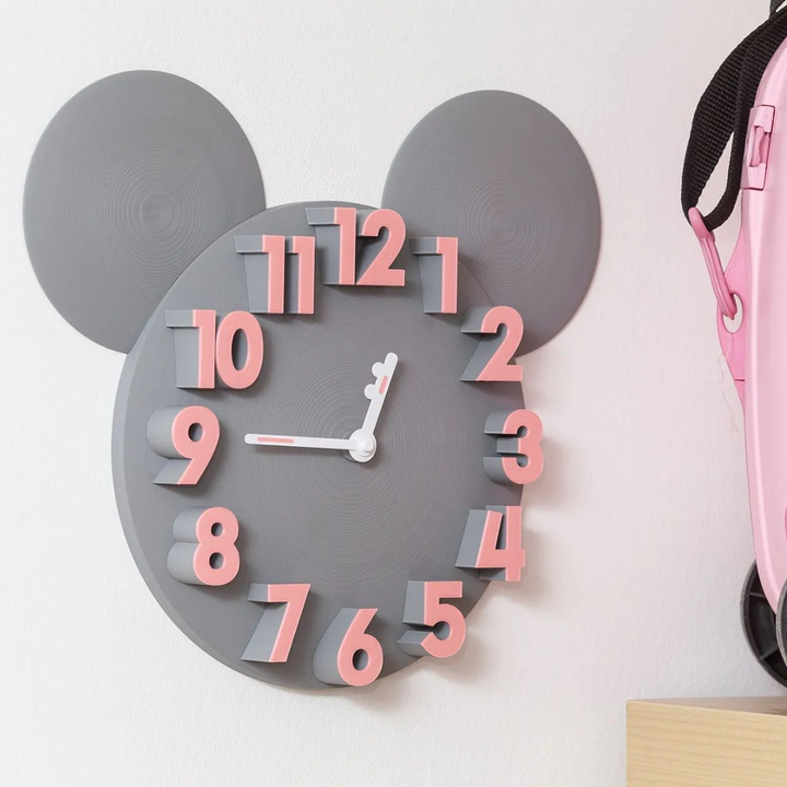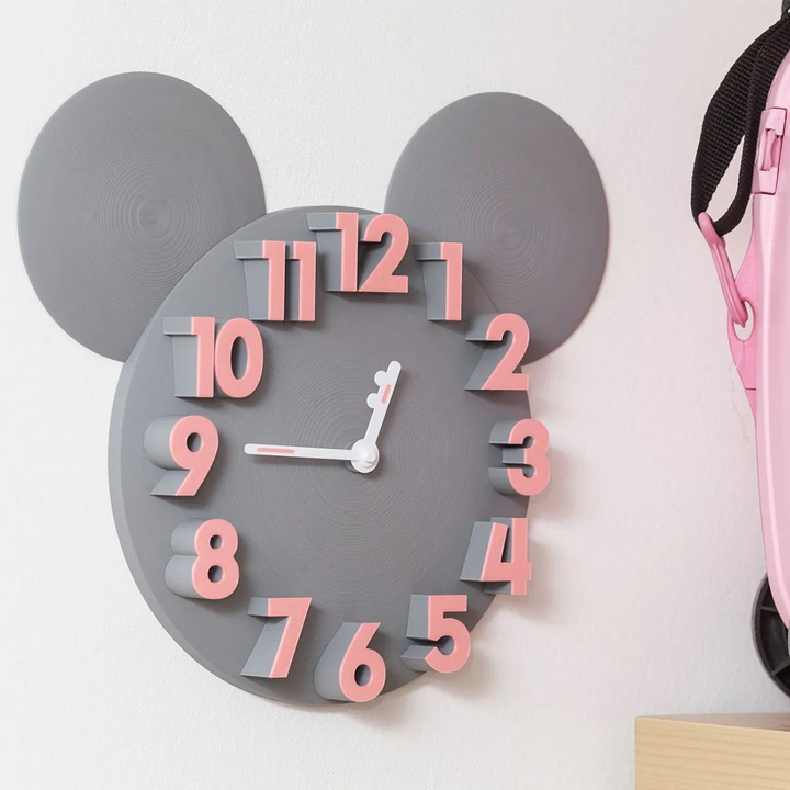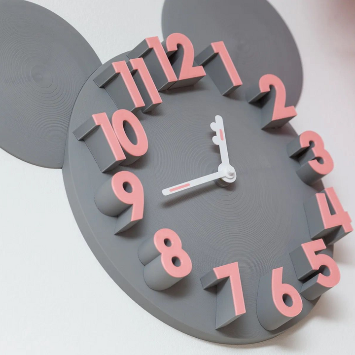 Add a splash of fun to your space with the Playful Pink Numbers Wall Clock. Featuring bold, three-dimensional pink numbers popping out of a smooth grey base, this clock brings a charming, modern vibe to any room. The subtle mouse-ear silhouette makes it perfect for kids' spaces, creative studios, or anyone who loves a playful design twist.